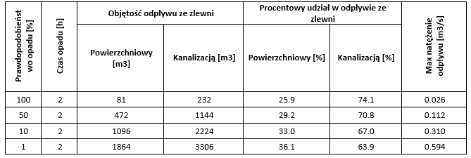 Jak przedstawia powyższa tabela, woda ze zlewni Parku Morskie Oko w głównej mierze powinna być odprowadzana przez istniejącą kanalizację ogólnospławną. Pomimo tego, lokalnie mogą występować podtopienia spowodowane charakterystycznym ukształtowaniem terenu, braku odpowiednio zlokalizowanych wpustów lub niepełną sprawnością działania sieci kanalizacyjnej. Tego rodzaju obliczenia mogą posłużyć w celu przedstawienia propozycji działań na terenie parku, pozwalające ograniczyć wpływ spływu powierzchniowego z terenu parku na podtapiane tereny w dolnej części zlewni.