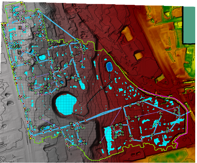 Zasięg modelowania 2D wraz z istniejącą siecią kanalizacyjną.